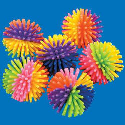 1 1/4” Vinyl Multi-Colored Porcupine Balls (32mm). (Make certain your parrot does NOT actually consume these!) Our parrots love to pull the "legs" off these toys ... and this triton cockatoo (Neptune) agrees ... what fun!
