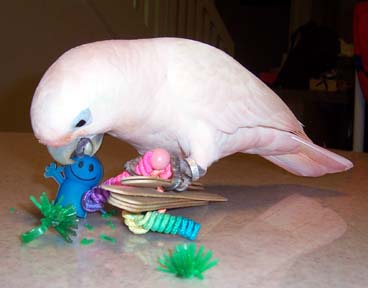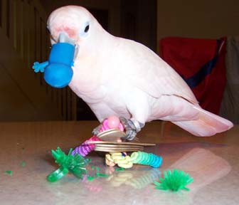 These smiling faces are perfect for sliding onto clothes pins, dowels or ParroStix to make an interesting foot toy or use your imagination, other parts and make your own toys. There is so many ways to use them to add fun to your avian entertainment selection of toys! Check out one of our foot toys that we've made with Smiley! Goffins cockatoo, Grommet, loves Smiley! (Pretty fond of tearing apart ParroRings too!)