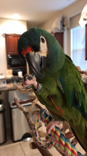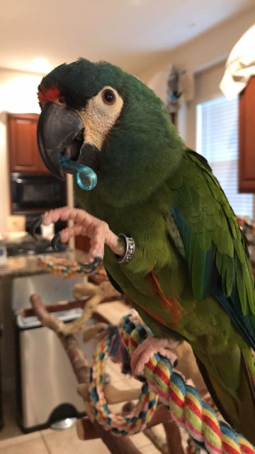 A fun pendant type dangling bead for your MYOT projects! And Mac (Illiger Macaw) is showing you that you don't even need to string them, they're great as a foot toy too!! (Click here for the size comparison chart)