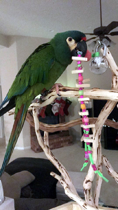 Our parrots love beaded toys and they love balsa! So we teamed the two together with some interesting shapes and textures and created the Beads Balsa & Bling toy! This Beads Balsa & Bling is strung on a neon shoelace (simple loop on top so you can use your own quick links and keeps the cost down) topped with a colorful 1" wooden ball on top, featuring some triangle shaped balsa slices, separated by some fancy beads and a hidden knot under the barrel beads (makes it much more challenging for your feathered family). This is an exclusive, Busy Beaks toy! Amy and Josh's Illiger macaws, the brothers Mac & Larry, love beads and obviously are enjoying the balsa too!! Larry (above) is demonstrating that every bit of the Beads Balsa & Bling toy are worth investigating ... proving it to be a tongue teasing fun toy! Handsome, happy boys!!