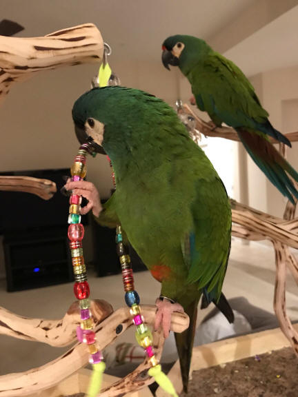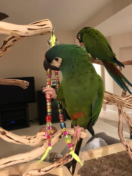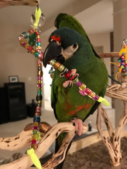 This bead toy was designed for the more aggressive beaks. There are all heavy duty beads in this toy, much more difficult to snap or pop. The cube bead is sort of a bead in bead, separated (and hiding knots) are the iridescent chunky barrel beads, followed by the fancy chunky beads ... topped with a large macaw parrot pendant with a transparent petal bead cap. All done on a bright, cheery, chewable neon lace! Thanks to Amy and Josh for sharing photos of their Illiger macaws (brothers Mac & Larry). These boys absolutely love, love, love their bead toys. Goes to prove that Busy Beaks are Happy Beaks ... such healthy, handsome, happy boys!!