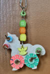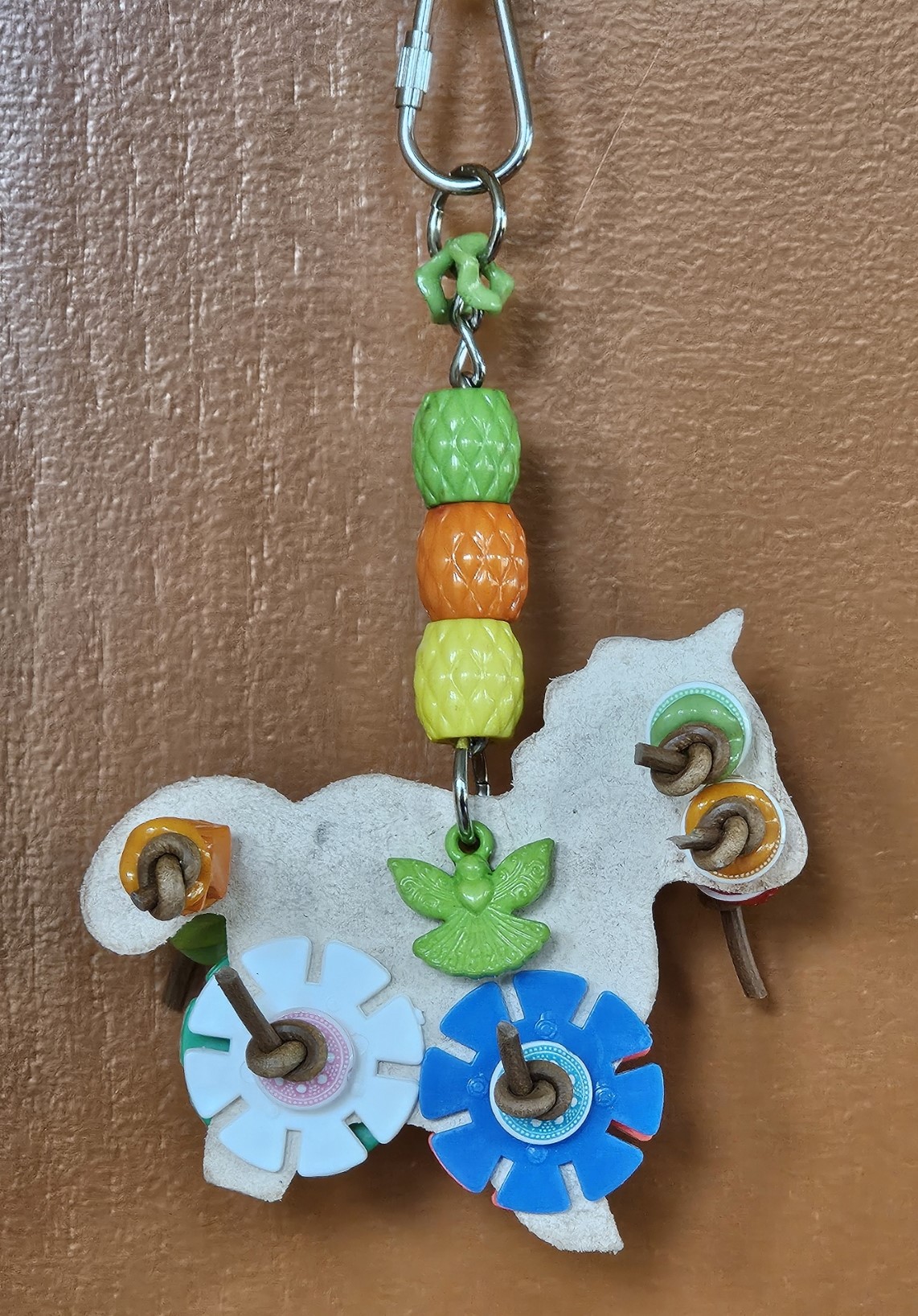 Pony Time starts with a USA vegetable tanned leather horse (3.75" x 3.5") with six holes. There's bird safe nickel plated, welded chain on top with 12mm "O" rings connecting chain to pony body. The chain is covered with three Quilted Chunky Barrel Beads for added tongue teasing fun! The adornments are a fun assortment of angel beads, tower twist, petite ruffled beads, flower wheels, and more secured with leather lacing. There is a nickel plated pear shaped quick link on top for easy hanging. A fun, refillable toy for the mid-sized birds in your life. All parts used are highlighted, just click on the links to order and make your own or get refills to remake your own Pony Time.