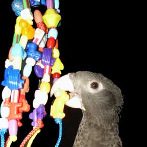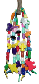 Does your parrot love beads? Greater Vasa, "Vasa Madda You" aka Maddie, made short work of regular beads, this one is keeping her busy and our GSC2, Chapin, adores to pop beads. She goes through the smaller ParroBeads (which incorporates standard pony size beads) quicker than I can string them. So we came up with this idea, 6 legs of Paulie Rope filled with a mixture of all large, heavy duty beads. Lots of varieties of beads, shapes and textures, all hung from a natural coconut hook that you can use time and time again!