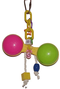 A rattle with an attitude! This is hung from plastic chain, has some 100% cotton cord with hard plastic beads attached, a pacifier that dangles for added texture, motion and fun! All hung from a quick link for easy hanging and the rattle has a nice sound when it wobbles! Great for the smaller birds to perch on and a good toy for the mid-sized FIDs in your house!