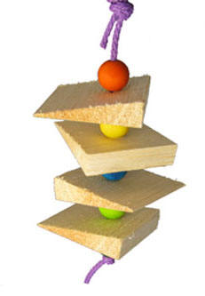 This is a simple toy, hung on poly rope, separated by colorful wooden beads and wedges of soft, chewy balsa in between the beads! There's a loop on the top so you can use your own quick link (and helps keep costs down). If you want a quick link ... click here to order. Great for smaller birds who enjoy gnawing on balsa! The birds love those balsa angles for beak teasing fun! If your parrot loves balsa ... check out this page!