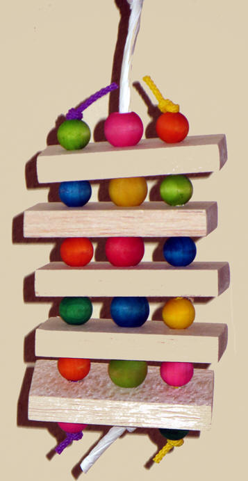 Balsa Step If your parrot loves Balsa, you need to try the Balsa Step from Mighty Bird's Balsa Collection. The Balsa Step has five slabs of balsa (3.5" x 2" x .5"), separated by colorful wooden balls. Strung on paper rope, the colorful balls on each side are a bit small and strung on poly rope. This is a fun, shredable toy for those Busy Beaks in your house that enjoy soft, chewable balsa! If your parrot loves balsa ... check out this page!