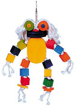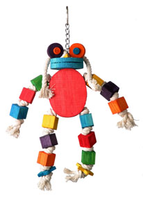 Isn't this just one of the cutest frogs you've ever seen? What fun for your FID from the 100% cotton top rope "hair," wooden eyes, cubes for arms and legs, all knotted in between so it's not a snip and drop to the bottom of your cage! Perfect for most mid-sized parrots like Greys, Amazons, Eclectus, etc.