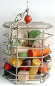 to include in your cage) are just a few inexpensive ways to refill the basket! The B&G Macaw, Jazzi, photographed top right gets left over goodies put in the nut cage like wooden pieces broken off of other toys that still have chewing life, some bamboo, cardboard ... great place for recycling those pre-chewed toy parts!