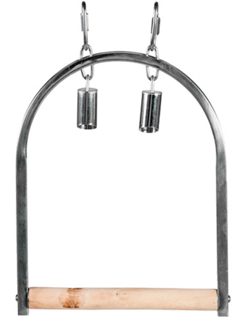 Stainless Steel Swing w/Bells Years ago, I used to give a talk on "make the most of your real estate". What that meant is ... make your feathered families housing environment the very best you can especially when you are gone for several hours or all day long. So perches that are also toys is one way of doing that without over crowding a cage. This is another good example! This is a swing (stabilized since it's connected in two locations) so it works well as a swing, perch, and the stainless steel bells are an added interest. The perch portion of the swing is replaceable so this is truly one of those toys/swings that should last you a lifetime with just minimal care. Inside measurements on the swing are 8" tall and 7.25" wide.