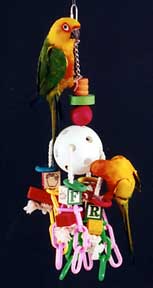 ABC blocks, hardwood beads, colorful wooden rings, slats of wood and plastic chain, with a 4" diameter whiffle ball center, all strung on a nickel plated welded chain, topped with a nickel plated quick link for easy hanging and a large bell on the bottom for a ringing good time. Photographed with sun conures using it at a perch, this toy is sized for most smaller to medium sized parrots and especially loved by our Congo African Grey, Noah!