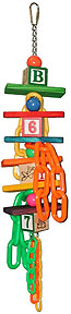 ABC blocks, separated by colorful beads, slats of wood and plastic chain, with more a smaller plastic chain on the bottom, all strung on welded chain and topped with a nickel plated quick link for easy hanging.