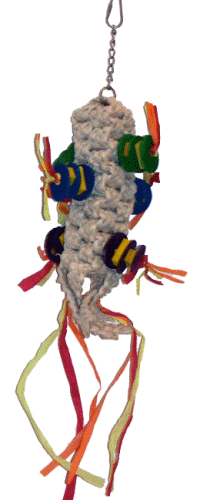 This fun, destroyable Frond Lanyard is made of 100% natural grass fiber and woven in a fashion that will tantalize your parrots beak! There is colorful paper ties holding colorful wooden disks and wood pieces ... hung from a nickel plated welded chain and a pair shaped quick link for easy hanging. Use your imagination and stuff some small nuts or dried fruit in the openings to encourage foraging. Sized for most mid sized parrots like Amazons, smaller Cockatoos & Macaws, Eclectus, greys and larger conures.