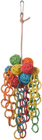 There are 10 colorful munch balls strung on vegetable tanned leather with colorful vine circles hanging down topped with a nickel plated pear shaped quick link for easy hanging. Since birds do see in color, they are very attracted to the colorful munch balls which could be stuffed with goodies to enhance the foraging experience. Use your imagination to enhance these munch balls to enhance and encourage your parrot's foraging nature! Great toy for mid sized birds like Conures, Timneh African Greys, Small Cockatoos or Macaws and like sized birds.