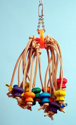 This is a chewing parrots' dream come true, acrylic center is filled with sisal, vegetable tanned leather strips and colorful hard wood pieces. Hung from welded smooth chain and a quick link, this is a great toy for those over preening or feather picking birds in your house and you can reuse the acrylic center time and time again! Check out the refills of leather strips, colorful sisal, and check out the parts page for more drilled knobs, acrylics pieces, draw pulls, spools, balls, wooden slats, pine cubes, ABC blocks and so much more! Recycle those acrylic centers to make new creations of your own!