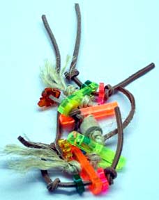 The center of this foot toy is a knotted vegetable tanned leather strip, with three 2" acrylic slats that have knotted vegetable tanned leather strips and natural sisal rope, plus acrylic shapes and several colorful wooden beads for added beak appeal. A fun, flexible foot toy that offers multiple textures. Be sure to save those acrylic shapes to use in making your own or rebuilding pre-loved toys!