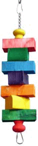 Colorful, chewy pine chunks strung on nickel plated welded chain and topped by a pear shaped quick link for easy hanging. Shredable, destroyable, affordable ... perfect for your mid sized beaks!