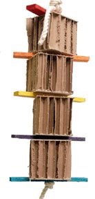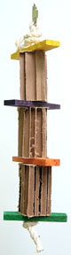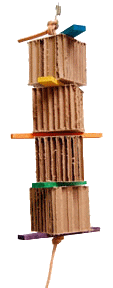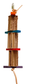 Safe, FDA approved non toxic paper board that makes for great shredding fun! 100% cotton rope , colorful soft wood slats, lots of texture, lots of fun and topped with a nickel plated quick link for easy hanging. Also available in small! Kelawia (Katie) a Little Corella who loves Stick toys and Shred-X. Now available with vegetable tanned LEATHER strips!