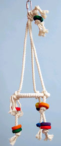 Lots of motion swing, perch, toy from Zoo Max which starts with 100% natural cotton rope with colorful wooden knobs and discs for more chewing fun. A fun toy for those smaller beaks in your house.