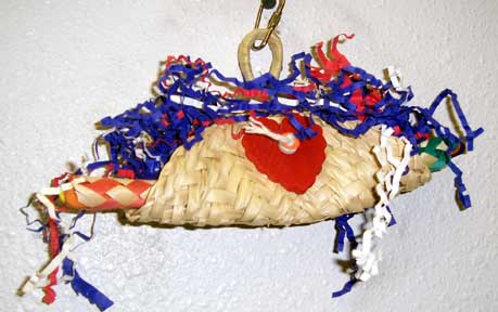 Part of the fiesta line of fun shredded paper toys comes the Fiesta Taco. There's a natural woven fan that is folded in half and filled with shredded paper, parrotraps and colorful wooden craft sticks, tied with 100% cotton rope with a big scalloped edge wooden heart with foam beads for added texture and beak pleasing fun. Great for your smaller to mid-sized parrots!
