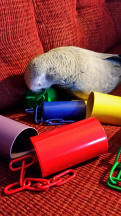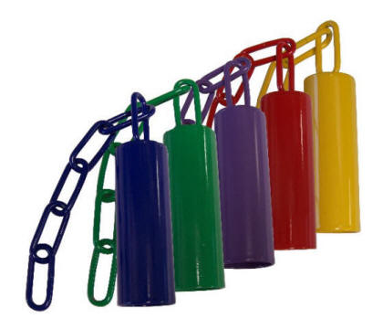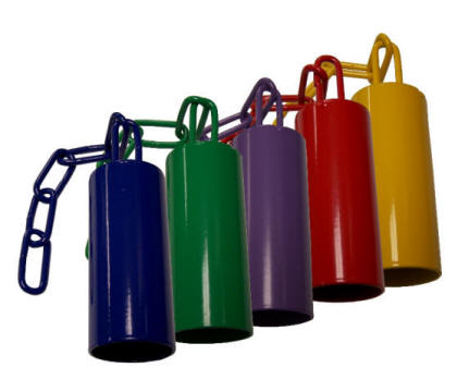Five colors from which to choose (blue, green, purple, red, yellow), solid chain with a welded clacker! Perfect for even the most destructive FIDs! At this price, you can get one of each! NO QUICK LINKS ARE INCLUDED ... use one that you already have or ... this chain is large enough to accommodate most pear shaped or quick links. Use your imagination to change the looks of these bells-add a bit of sisal through the chain and put goodies on it or place some "bagels" over the chain for added chewing fun with a special "ring" to it! A must for all size birds.