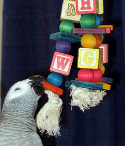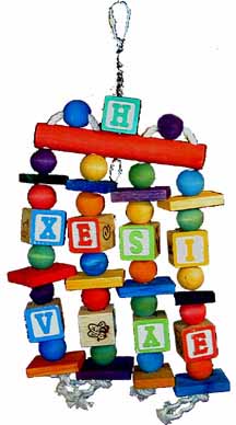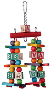 Katy's ABC Jr is all the same fun as the regular sized toy, just smaller so it can be loved by smaller beaks in your house like conures, caiques and like sized parrots. Lots of motion, ABC blocks, colorful wooden balls separated by wooden slats for more beak pleasing fun! Strung from a nickel plated welded chain and topped with a quick link for easy hanging, this is a toy sure to please your African Grey (like Gandy pictured above), amazons, eclectus, smaller macaws and cockatoos alike!