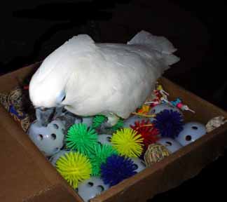 Riley (U2, above left) can't await for her packages to arrive, parront Michelle says that Riley has to just "DIVE INTO" her Busy Beaks' boxes! Zachary is playing with the golf ball size fun balls, use your imagination and incorporate these fun balls into your own projects for even more avian fun!
