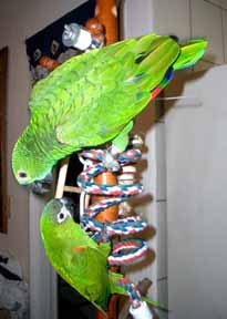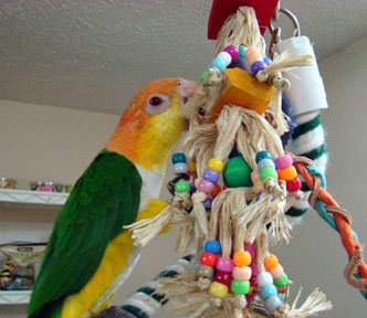 You can see that Chickie (Caique, center photo) is having a great time with her Dancing Balsa and Saroj is doing a great job of maximizing her play area by placing a cotton curl (birdie bungee) from the ceiling and using that as yet another play area ... well done, Saroj! AND as you can see from the photo above right, this pair of birds (Blue Front Amazon and Hahn's Macaw, who live in Taiwan) have a very creative "parront" (that's a parrot's parent ... ) Dylan who uses the curl (you could use the bungee just as easily) on a tree to make a play stand (along with a ladder and some other goodies). A little imagination sure goes a long way with helping to keep our FIDs (feathered kids) entertained!