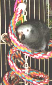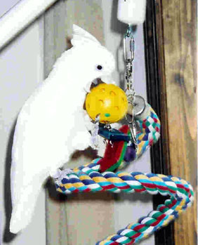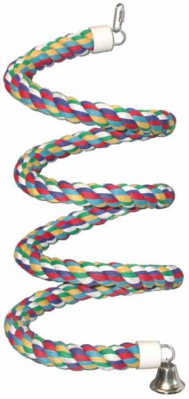 We just can't keep these in stock, our parrots love them and our Eclectus, Eddie stands guard on his! As a matter of fact, in our house, it's the Eclectus that are the most destructive with their bungees. No matter what you want to call these spiral coils of rope, be it a twist, curl, bungee, or boing ... it's an absolutely MUST HAVE in their cage! Every birdie's house should have a bungee! Made of 100% colorful cotton with a quick link on top for easy hanging and a bell on the bottom, it can be twisted and turned to fit almost every cage!