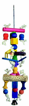 A large parrots delight with lots of textures, shapes and color, cholla for those cactus loving birds, plastic chain for added motion, hardwood spools, soft wood slats, something for every birdie in this toy!