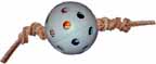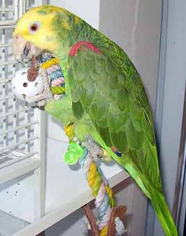 Whiffle ball is stuffed with multicolored pony beads. This toy quickly became a favorite in our house (our cockatoos LOVE to play and destroy these) and it's also a favorite of YHA Zachary (picture above). If your mid-sized parrot (Amazons, Eclectus, Greys, smaller macaws and cockatoos too) love foot toys, they'll LOVE this toy.