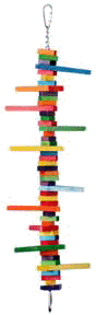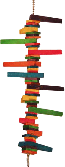 This is just a FABULOUS toy! Our bigger beaks LOVE the original Triangle Teaser and now there's a version for those smaller beaks in your life! Geometrically shaped 1" x 1/2" rectangles of 1/4" thick pieces of soft, chewy wood with a dozen colorful triangle pieces (3" long and 1" wide at the widest part) are just perfect for snipping off the tips. It's all strung on a nickel plated chain with pear shaped quick links on both sides (save the materials and restring with other goodies)! Get creative! Use it as a bridge, hang it vertically, horizontally ... it's a terrific new toy from Super Bird Creations! Caique, Chickie is using Rooster Cogbird as a perch while enjoying some of the tail feathers! Too funny! You can see the mini tri teaser in the background, also nibbled on! Thanks for sharing, Saroj, Chickie is a real cutie! For those big beaks in your life, be sure to check out the original Triangle Teaser!