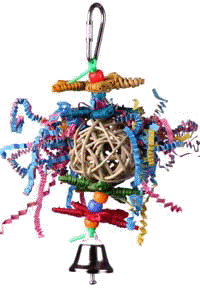 A 'lil tweet ball of fun starts with mini woven stars separated by colorful pony beads on top and bottom of a small fiesta ball stuffer. There's a nickel plated pear shaped quick link on top for easy hanging and a bell on the bottom for a ringing good time! Great choice for parrotlets, small conures, parakeets, cockatiels and like sized birds. Encourage your parrot's foraging experience by added some favorite goodies (JUST fruit, JUST veggies, nuts, popped corn, etc.) inside the munch balls! For more foraging options ... click here!