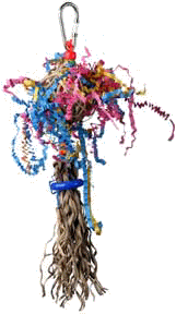 You'll put a smile on your 'lil tweet's beak with this fun preening foraging toy from Super Bird Creations which has lots of natural seagrass for even more chewing fun. The munch ball is stuffed with colorful, crinkle cut paper and you can encourage their foraging behaviors by adding some favorite munchies (JUST fruit, JUST veggies, nuts, popped corn, etc.) inside the munch ball! There's a nickel plated quick link is on top for easy hanging. For more foraging options ... click here!