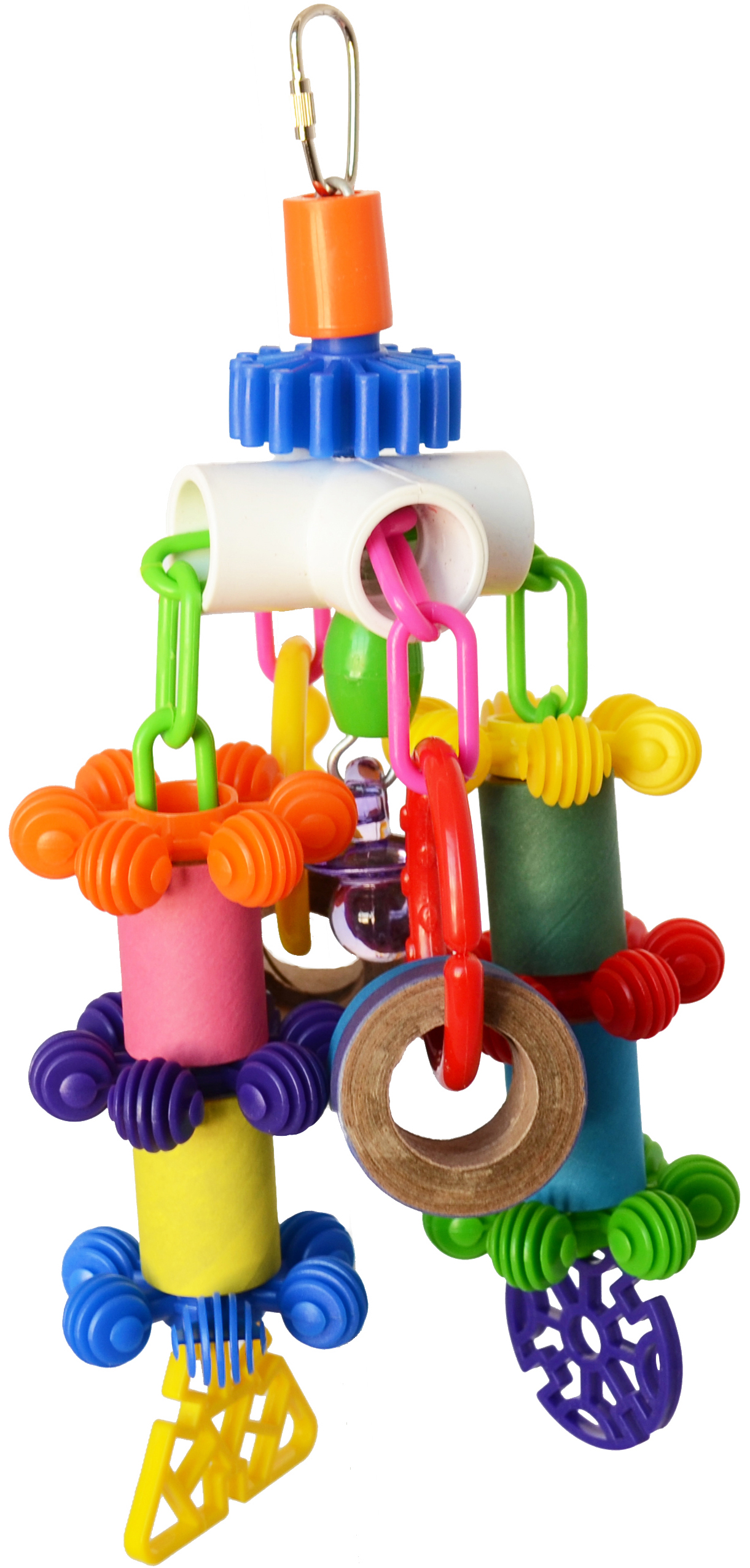 Lots to do with this durable Four Way Fun from Super Bird Creations! There is a four way PVC piece on top with four plastic chain legs of assorted beak pleasing fun including wheels, textured stars, bagel tubes, bagelettes and doily disks. with a nickel plated quick link on top for easy hanging and a chunky pacifier in the center. It's durable design allows for owners to easily refill the toy with more bagels making for an economic way to extend the toy's life. Designed for the mid to larger size beaks in your life (i.e., Amazon, Eclectus, Greys, smaller cockatoos & mini macaws). Click on photo for larger view.