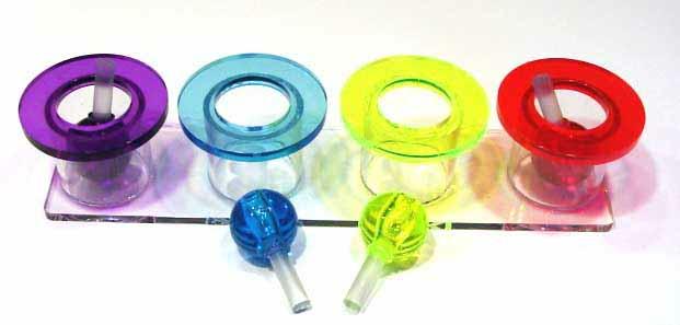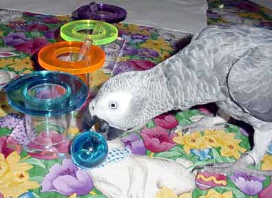 The brightly colored swizzle sticks match the acrylic cup rims on the solid acrylic base-pieces are removable with round "handles" for easy grabbing by your FID! (It's a great way to spend some quality time interacting with your FID, just ask Roca who's pictured above left and lives in The Netherlands with her mum Jessie Claire, she's gotten really good at this game!) Buzz (CAG pictured on right) just got his Swizzle Stick and he's getting a handle on it!!