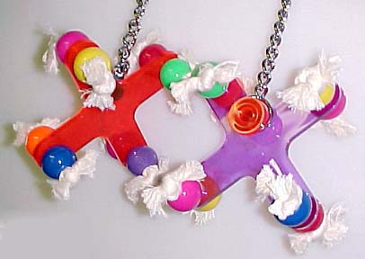 Nickel plated, welded chain on top with a quick link for easy hanging is just the start of this fun Wiggle Ball toy from Bell Plastics of the Sierras. The acrylic cross has holes in each corner with large hard plastic balls knotted on each side. Lots of motions and texture in this long lasting acrylic toy that's been sized for medium sized parrots, cockatoos and macaws!