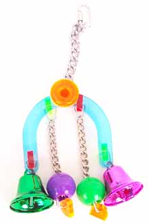 colorful aluminum bells on each end and chains in the middle with moveable balls