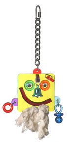 Mr. Bojangles has so much going on his 3-1/2" square acrylic face, from the 100% cotton beard to his mismatched earrings of an acrylic shape on one side and a pacifier on the other! He has a a bright colored aluminum bell for a nose and shapes with moveable eyes plus one pierced eyebrow. Just too cute!